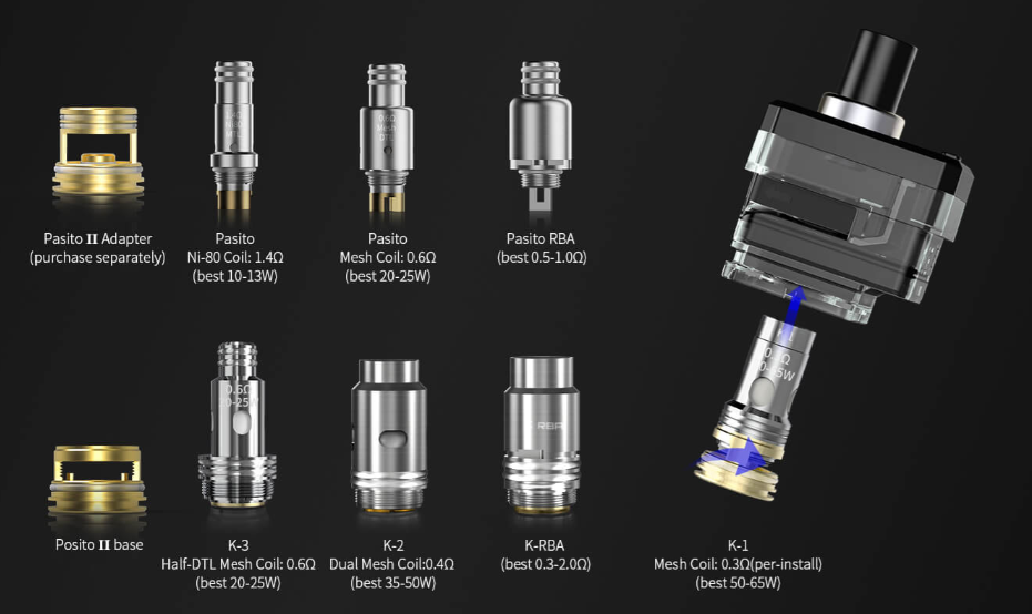 Картридж в этом устройстве достаточно интересный, так как в нем можно использовать два испарителей – Pasito и Knight 80, причем для каждого из типов используется своя база. Стоит отметить, что использование обслуживаемых баз двух типов также предусмотрено.
